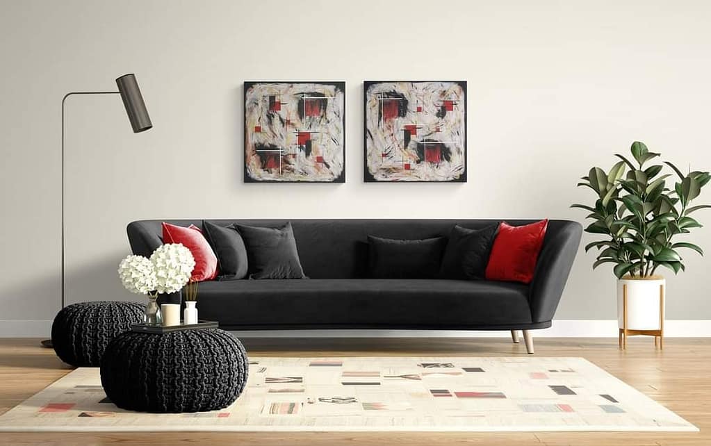 Minimalist geometric diptych in bold black and red and faint organic drips on metallic background. Sparse, balanced, and contemplative – evoking presence and quiet tension. Ideal for modern minimalist spaces.