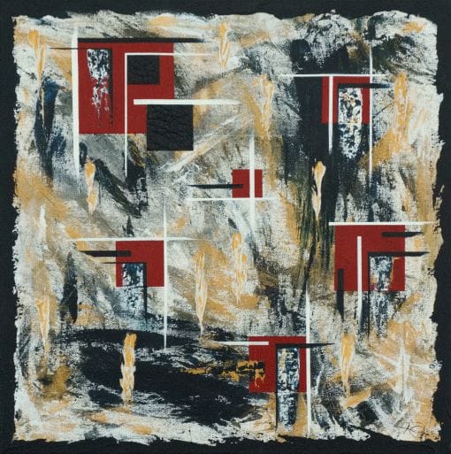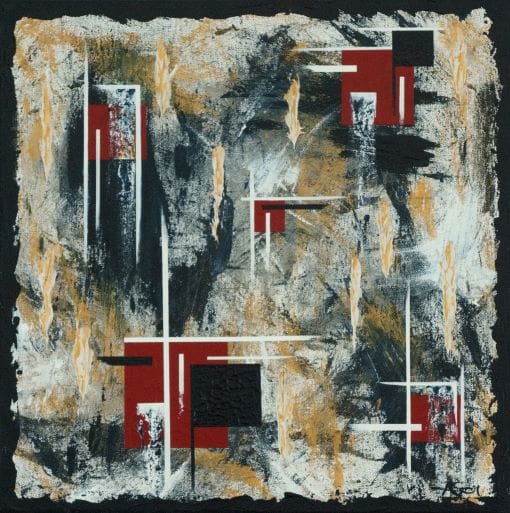 Eleven red squares with intersecting white lines, black boxes and dripping paint on textured gray and metallic background.