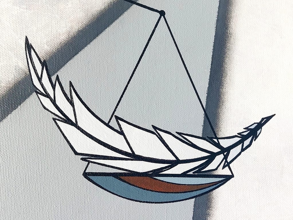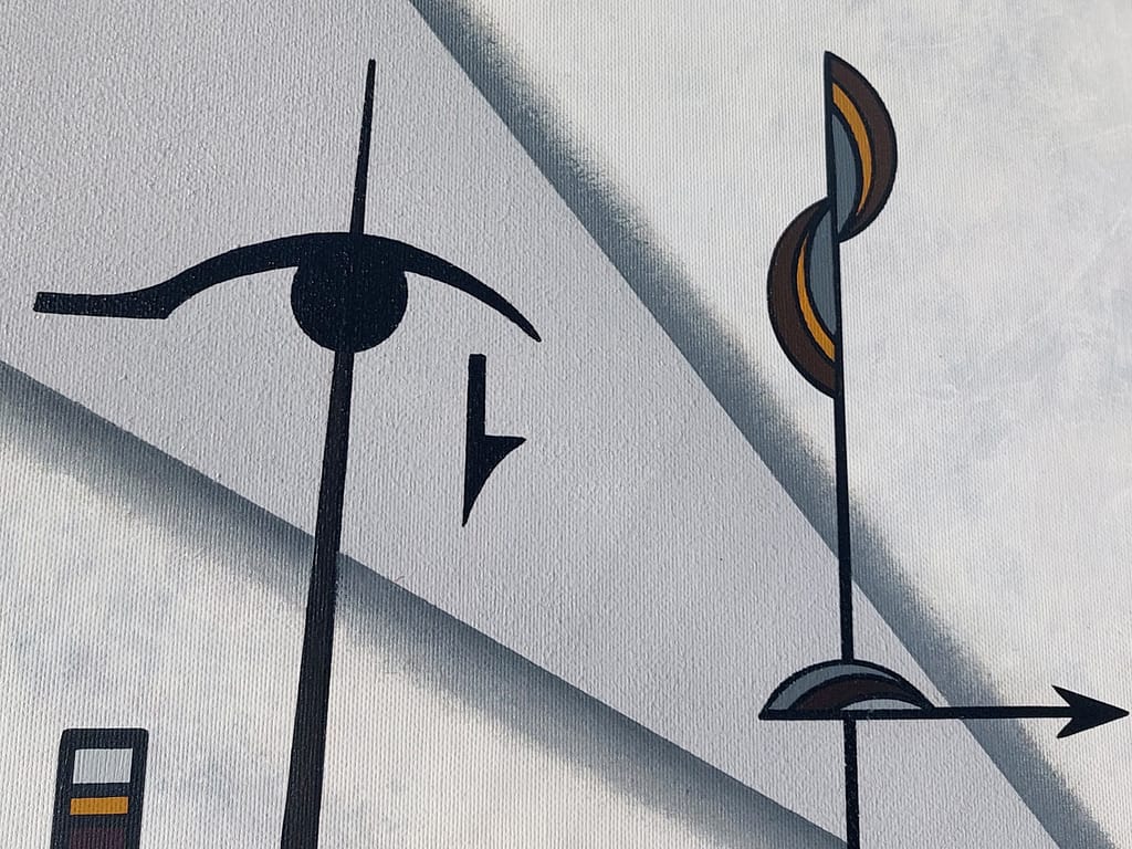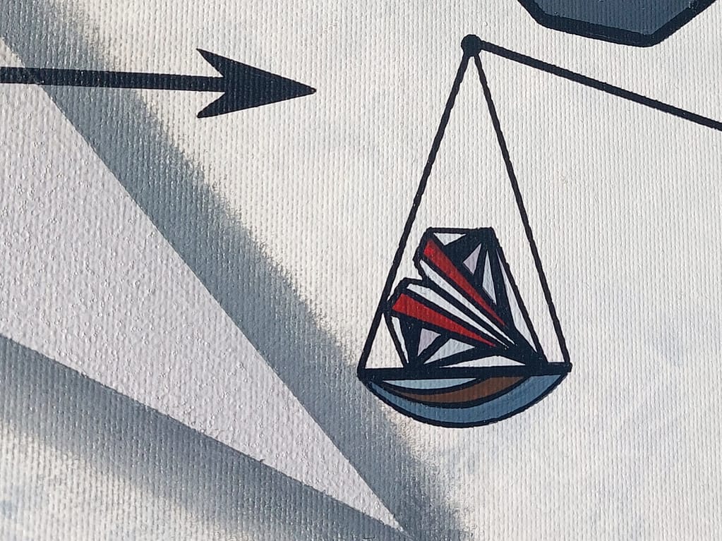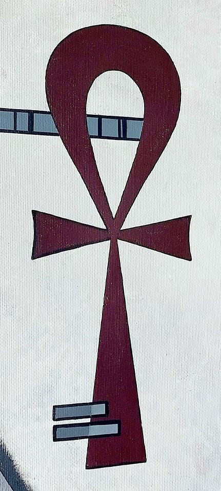 MASTERKEY is a dyptic with Mindscape and embodies the spiritual Master Key to higher dimensions, inner mastery, and divine potential. A monumental central key anchors the canvas as it carries the Egyptian spiritual symbol of weighing the heart against the feather of truth for the journey to the afterlife, when the heart needs to be lighter than the feather. To and from the key lies a path of wisdom. A magic wand with the third eye watches the geometric mysterious landscape and the Egyptian Ankh for eternal life, – altogether symbolizing spiritual unlocking, higher dimensions, connection to the divine and inner mastery.