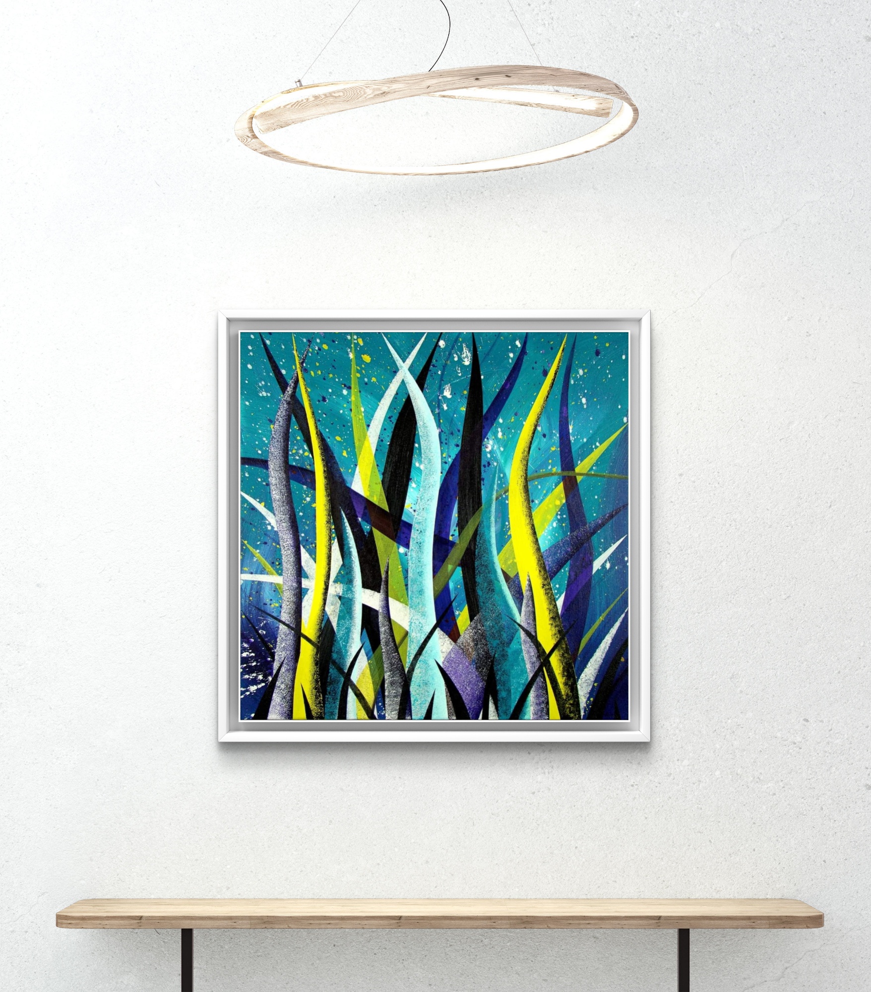 “Underwater Dream” is an abstract acrylic painting that captures memories rising from the subconscious depths to conscious awareness. Tall, swaying blade-like forms in vibrant yellow, teal, purple, black, and shimmering white arch upward against a rich turquoise oceanic background. Energetic splatters and textured strokes evoke drifting bubbles and gentle currents, conveying weightless emergence, quiet revelation, and the fluid mystery of the mind.