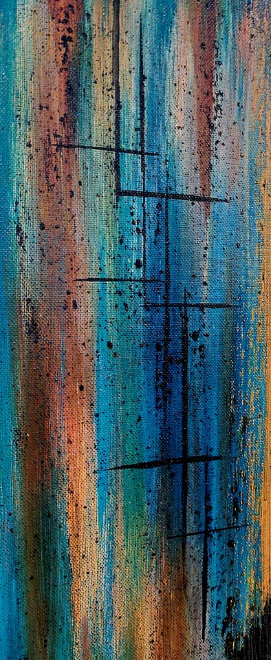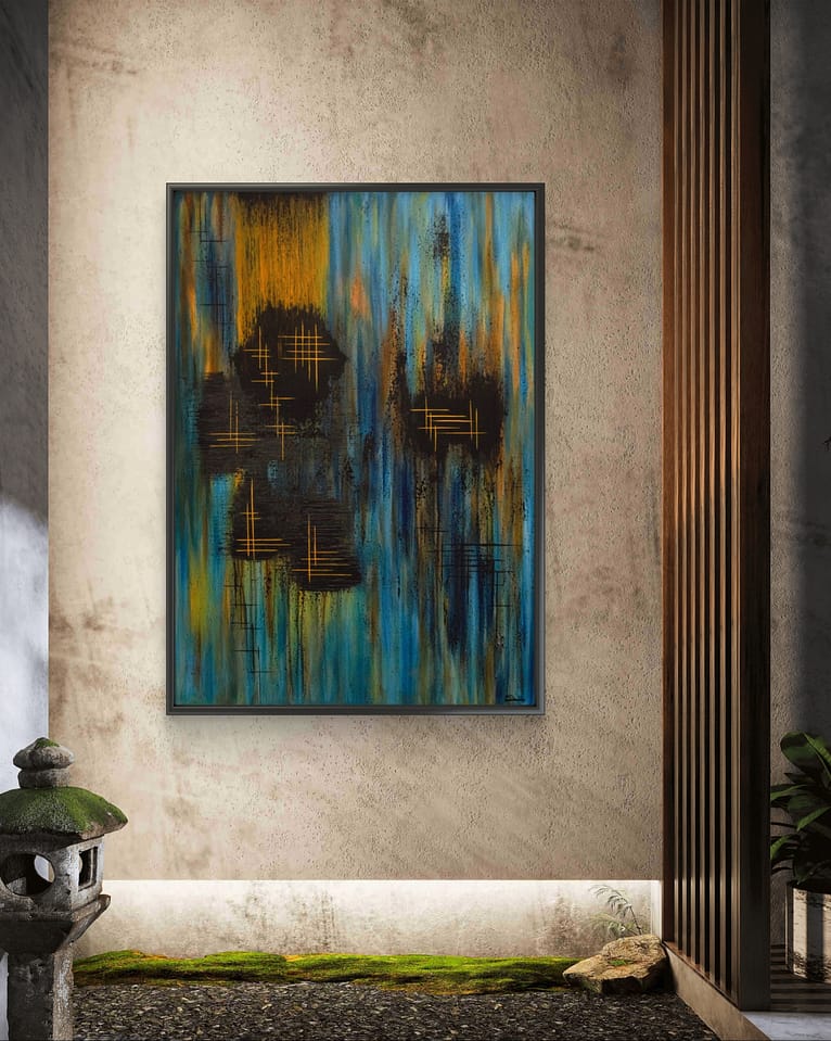 The interplay of bold colour gradients, dripped textures, and precise golden lines creates a sense of dynamic harmony and resonance: part atmospheric abstraction, part meditative energy field – inviting viewers to tune into their own inner frequencies amid the visual rhythm.
