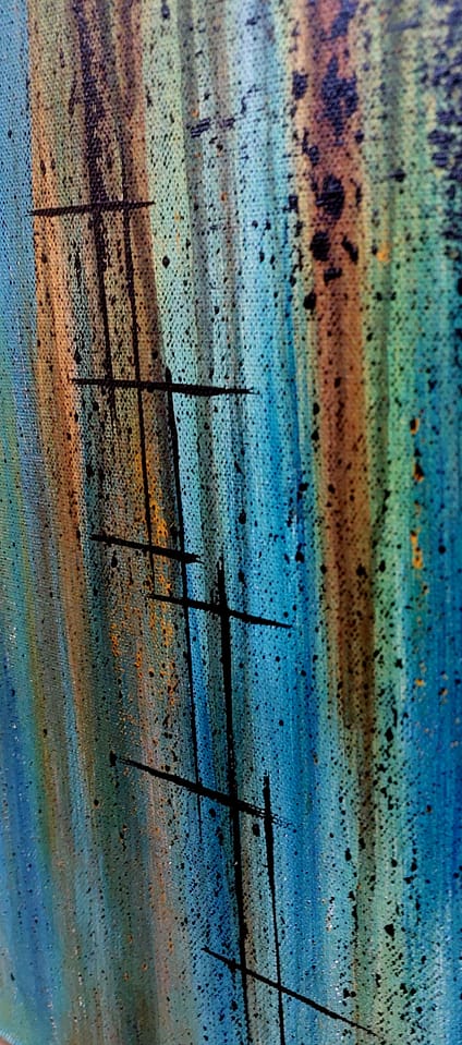 Dýptin í bláum og túrkís tónum á móti dökkum orkustöðvum með gylltum línum, – minnir á hafið og vermandi sólstafi inn í myrkur. Áhorfandinn stillir inn á bylgjulengd undirmeðvitundar sem skapar samhljóm og svörun við flæði listamannsins.
