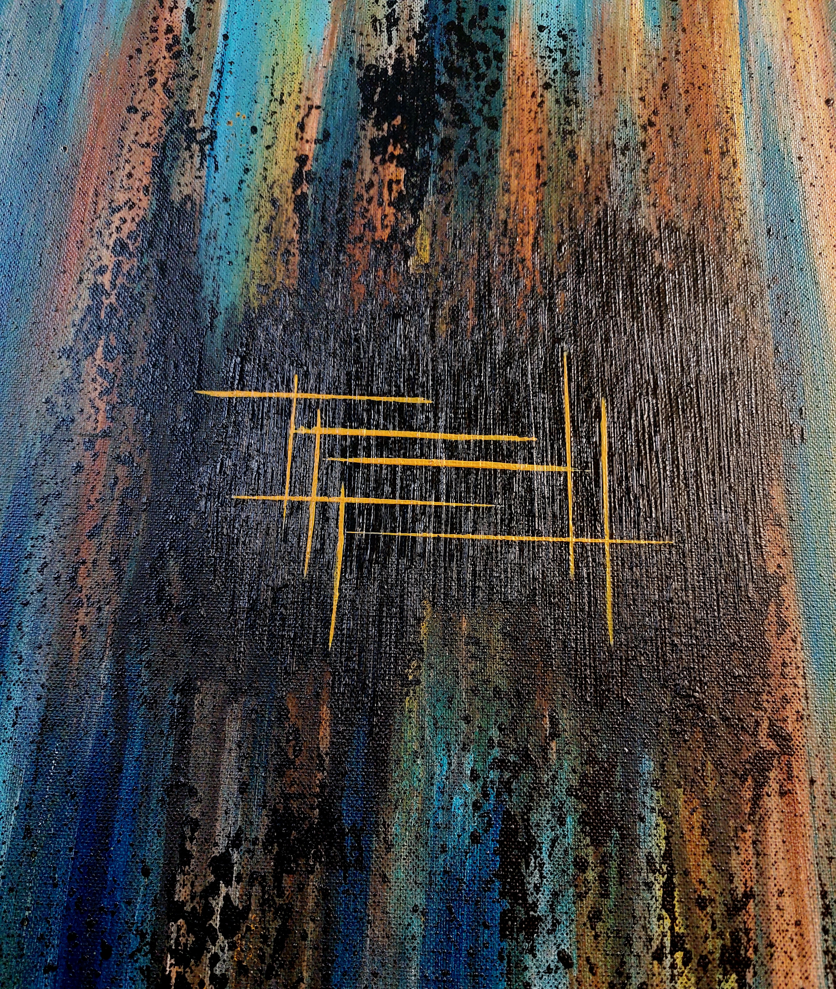 Dominated by a mesmerizing gradient of deep teal and turquoise blues, the canvas features layered, vertical textured strokes that evoke flowing energy waves or sonic vibrations rippling through space. Subtle gold and yellow linear elements—crisscrossing grids emerge like hidden frequencies or luminous signals against shadowy black forms that hint at energetic voids. The frequency reminds us of the warmth of Sun beams and the depth of the Ocean.