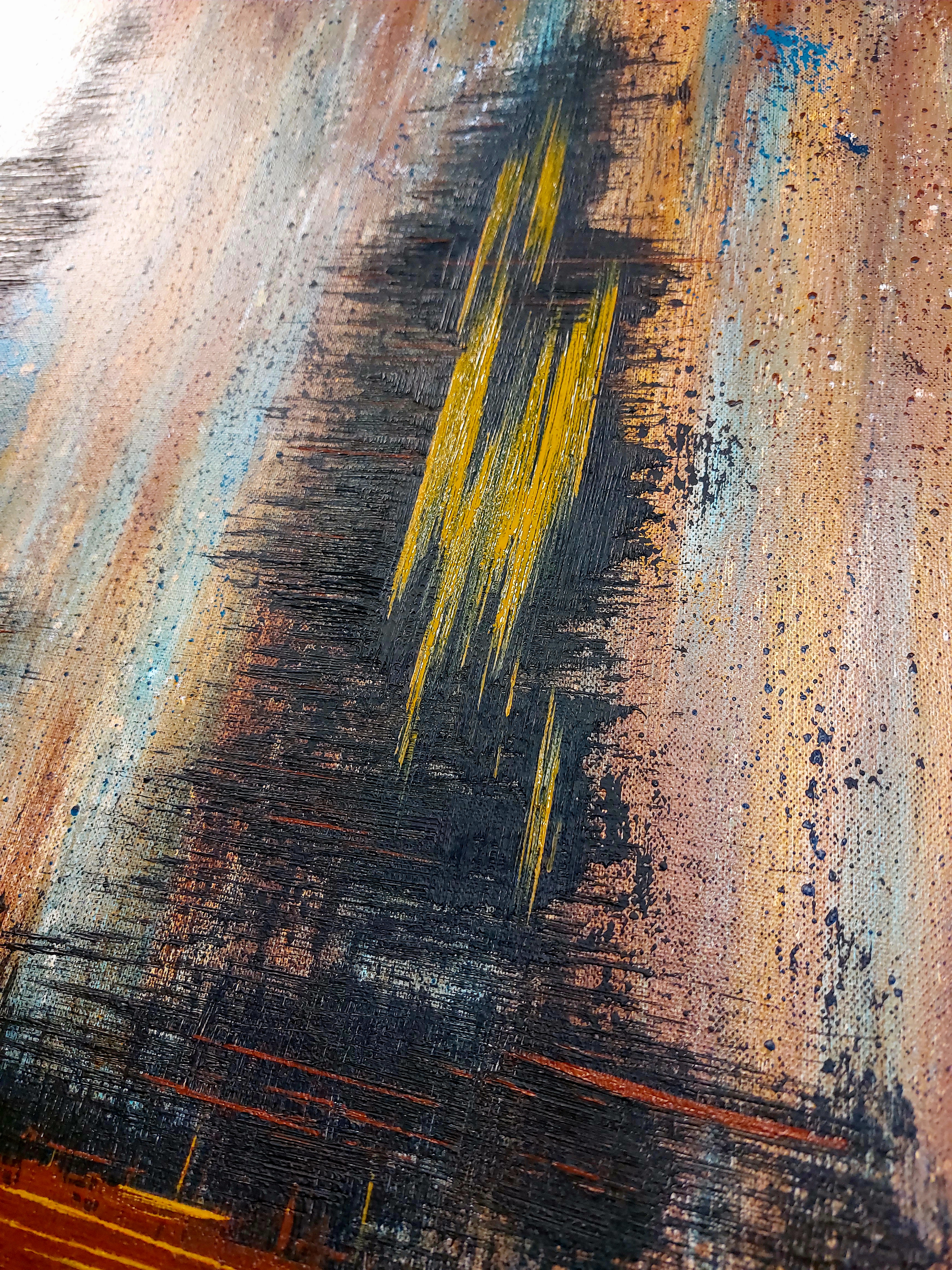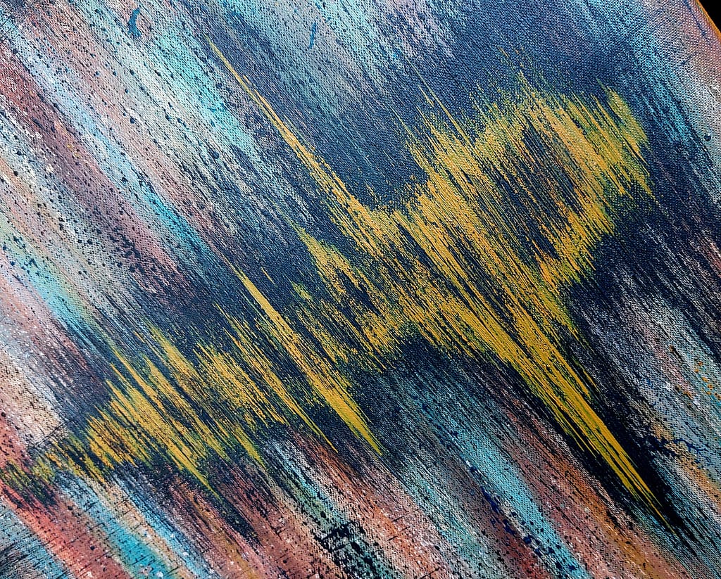 Layered textures create depth while jagged yellow waveforms pulse like visualized sound frequencies or energy spikes. Subtle teals peek through, adding contrast to the predominantly warm palette. The result is a meditative frequency, – rooted in earth’s materiality yet alive with dynamic harmony, inviting viewers to align and stay tuned.